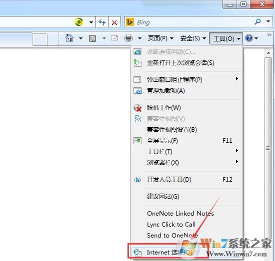 3、在點擊工具選項的下拉菜單里的Internet選項,如下圖所示:
