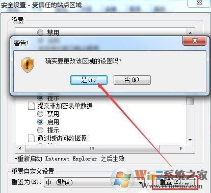 7、在安全設(shè)置受信任的站點區(qū)域?qū)υ捒蚶稂c擊重置,然后點擊彈出對話框的是,如下圖所示: