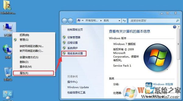 1、首先在桌面上右鍵點擊“計算機(jī)”打開菜單,選擇“屬性”進(jìn)入系統(tǒng)窗口,點擊左側(cè)打開“高級系統(tǒng)設(shè)置”;