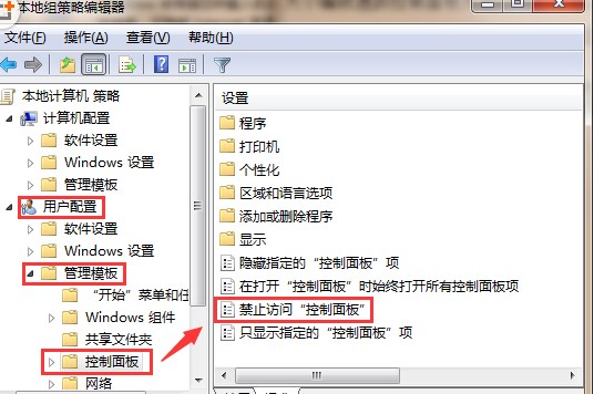 3、點(diǎn)擊“控制面板”后,在窗口右側(cè)找到“ 禁止訪問(wèn)'控制面板' ”,然后單擊右鍵,選擇“編輯”;