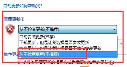 6、在“重要更新”下選項(xiàng)改為“從不檢查更新”然后點(diǎn)擊確定;