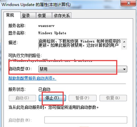 10、在該服務(wù)屬性窗口的“常規(guī)”選卡下,“啟動(dòng)類型”修改為“已禁用”,然后點(diǎn)擊“停止”;