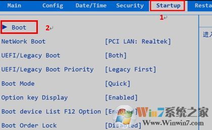 1、進(jìn)入BIOS后,選擇“Startup”選項(xiàng),并選擇“Boot”選項(xiàng),如圖: