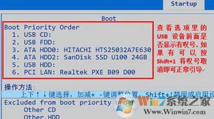 2、在“Boot Priority Order”選項(xiàng)里,查看USB設(shè)備前面是否顯示有嘆號(hào),如果有可以按“Shift+1”將嘆號(hào)取消,再按“F10”保存并重啟;