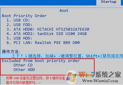 3、在“Boot Priority Order”選項(xiàng)里,沒(méi)有USB FDD等USB選項(xiàng),可以在“Excluded form boot priority order”中打到并按“X鍵”或“Shift+1”將對(duì)應(yīng)的設(shè)備調(diào)到可引導(dǎo)設(shè)備中搞定!