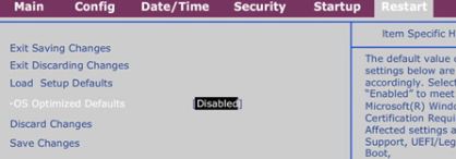 1、進(jìn)入BIOS,選擇“restart”-“OS Optimized Defaults”設(shè)置為“Disabled”,如圖: