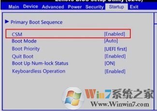 3、進(jìn)入startup界面,設(shè)置“CSM”為“enabled”;
