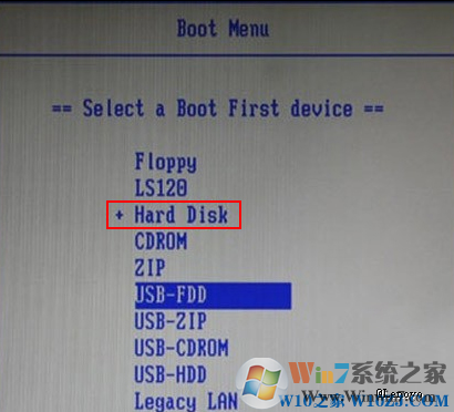 2、等待啟動項選擇界面出來后,然后根據(jù)實際情況選擇對應的引導設備,如+ Hard Disk后回車選擇對應的硬盤型號,如下圖所示: