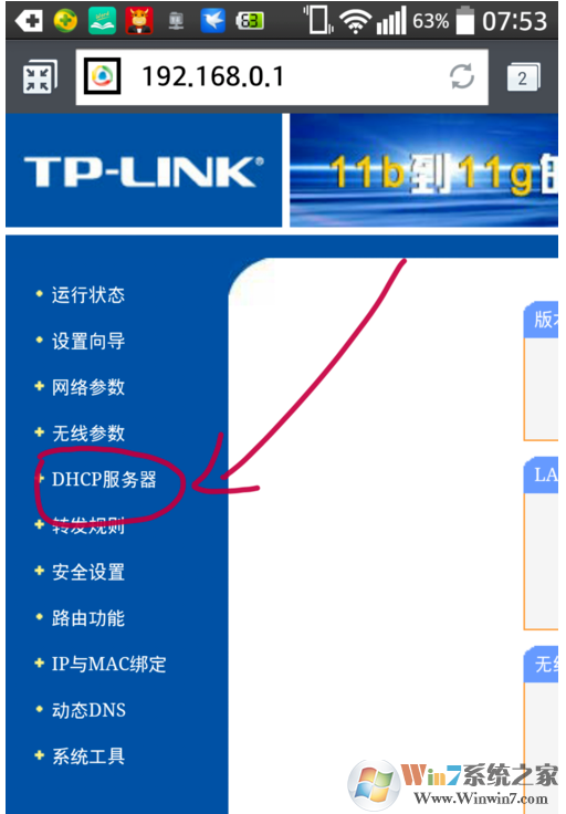 2、進(jìn)入路由器首頁(yè),如圖選擇“DHCP服務(wù)器”進(jìn)入配置界面。