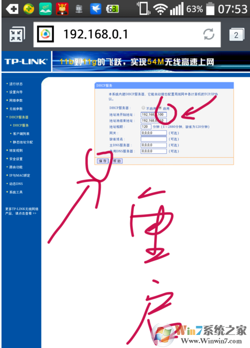 3、首先啟用dhcp服務(wù)器,制定dhcp服務(wù)器的IP地址分配范圍,IP地址租賃周期,其它沒(méi)有特別需要不用填寫。點(diǎn)擊保存。