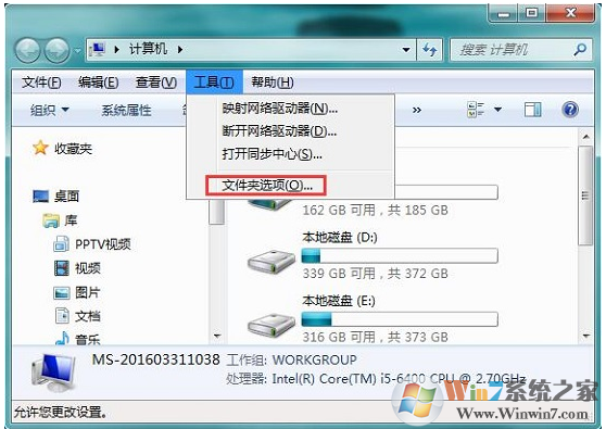 1、雙擊打開(kāi)計(jì)算機(jī)圖標(biāo),點(diǎn)擊工具下面的“文件夾選項(xiàng)”;