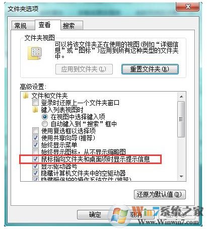 3、在查看標(biāo)簽下找到“鼠標(biāo)指向文件夾和桌面項(xiàng)時(shí)顯示提示信息”,并將其勾選,然后點(diǎn)擊確定退出即可,現(xiàn)在將鼠標(biāo)懸停在圖標(biāo)上就會(huì)顯示提示信息了。