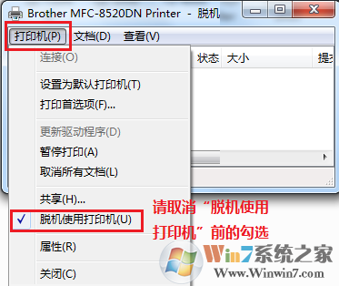 在[打印機(jī)]菜單中,取消勾選的[脫機(jī)使用打印機(jī)]。