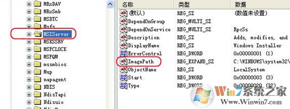 2、找到并單擊下面的注冊表項:HKEY_LOCAL_MACHINE\SYSTEM\CurrentControlSet\Services\MSIServer;