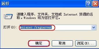 6、登錄到計算機。單擊“開始”,單擊 “運行”,在“打開”框中 鍵入 msiexec /regserver,然后單擊“確定”。
