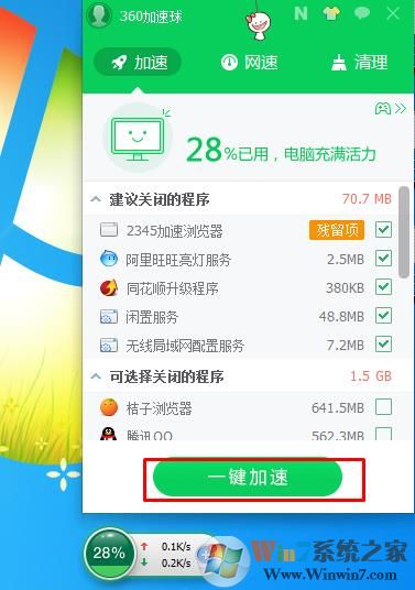 以360為例,點擊加速球,會自動列出建議關(guān)閉的程序,這樣就可以清理很多內(nèi)存,使內(nèi)存占用減少下來。