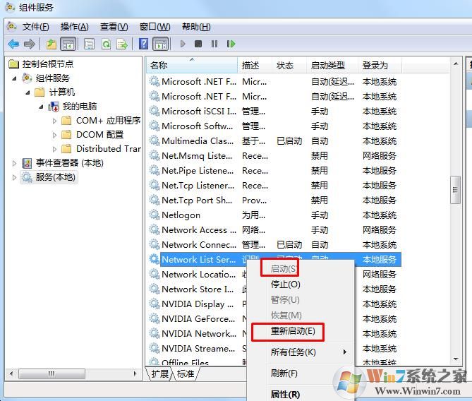 6.反回后,組件服務(wù)-服務(wù)-Network List Service-右鍵啟用,如果已經(jīng)啟動(dòng)的可以使用重新啟動(dòng)!