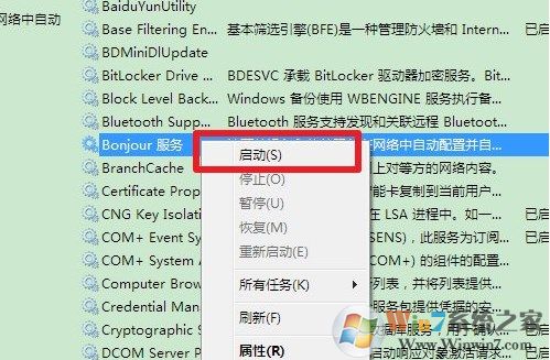 5、右擊【bonjour服務】,選擇【啟動】。