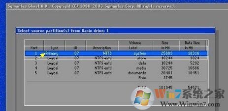 5、接下來選擇需要備份的磁盤,我們這里必須選擇C盤,不知道哪個是C盤 ,其實判斷也非常簡單,一般是第一項,并且可以看到Type下面有個“primary(主要的)”字樣,說明這個就是主盤系統(tǒng)盤,如圖: