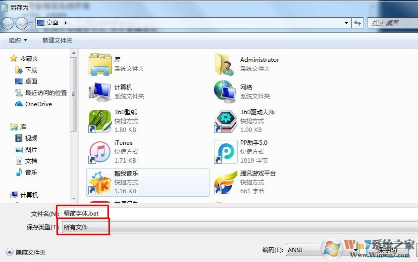 上述內(nèi)容輸入完畢后,接著將這個(gè)記事本文件另存為擴(kuò)展名為BAT的批處理文件(如“字體精簡(jiǎn).BAT”),格式選擇為所有文件,并雙擊運(yùn)行