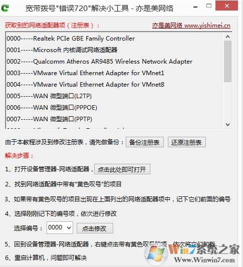 下載打開后,工具會自行獲取注冊表里的網(wǎng)絡(luò)適配器項,然后備份注冊表,如上圖所示,直接點擊備份按鈕就可以了,即使誤操作造成注冊表損壞了,也可以通過點擊還原按鈕進(jìn)行恢復(fù)。