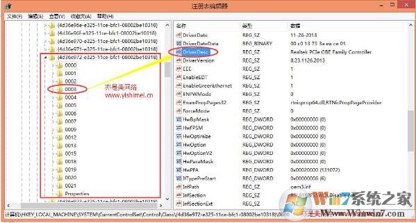怎么找呢?其實在網(wǎng)絡(luò)適配器里出現(xiàn)的所有項目,在注冊表里都有對應(yīng),它們就是{4D36E972-E325-11CE-BFC1-08002BE10318} 的子項0000、0001、0002...等,比如筆者隨便點擊選中子項“0003”,然后在注冊表的右邊找到“DriverDesc”,它后面描述著“Realtek PCIe GBE Family Controller”,其實這個就是筆者的筆記本的網(wǎng)卡型號,在設(shè)備管理器的網(wǎng)絡(luò)適配器里有這個項目的,大家可以去第一個圖中查看下哦。