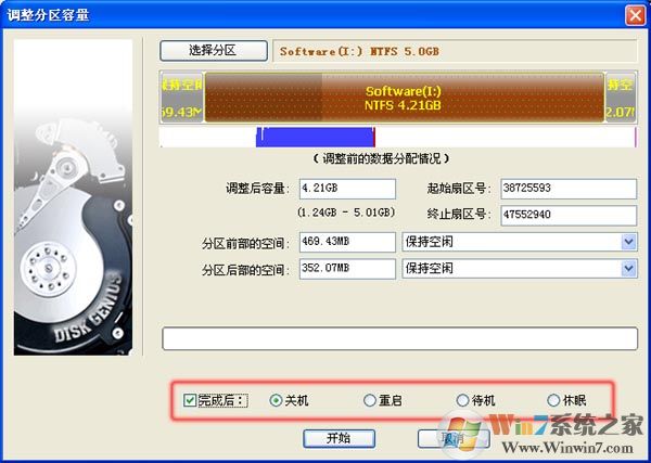 4、 當(dāng)分區(qū)比較大,分區(qū)上的數(shù)據(jù)比較多時(shí),無(wú)損分區(qū)調(diào)整過(guò)程的用時(shí)可能會(huì)稍長(zhǎng)一些,這時(shí),您可以指定調(diào)整后的操作,之后離開(kāi)電腦,先去處理別的事情,如下圖所示: