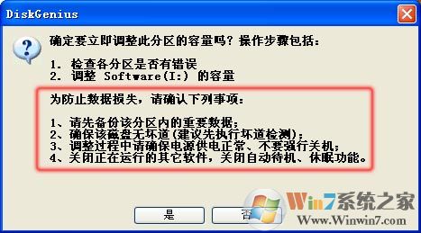 DiskGenius在開(kāi)始分區(qū)調(diào)整操作時(shí),也會(huì)提示您這一點(diǎn),如下圖: