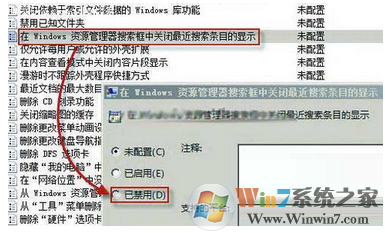 第二步:打開“用戶配置→管理模板→Windows組件→Windows資源管理器”,選擇右側(cè)窗格中的“在Windows資源管理器搜索框中關(guān)閉最近搜索條目的顯示”項目,雙擊該項目打開屬性窗口,在這里選擇“已啟用”,最后單擊“確定”即可啟用該功能,這樣以后就不會自動保存搜索記錄了。