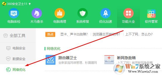 2、接著我們可以使用一些修復(fù)工具進(jìn)行修復(fù),如果電腦中有360的可以這么操作:打開(kāi) 360安全衛(wèi)士,點(diǎn)擊【功能大全】--【網(wǎng)絡(luò)優(yōu)化】,在網(wǎng)絡(luò)優(yōu)化界面使用“斷網(wǎng)急救箱”、“LSP修復(fù)”以及“DNS優(yōu)選”來(lái)進(jìn)行修復(fù)優(yōu)化一般即可解決問(wèn)題。
