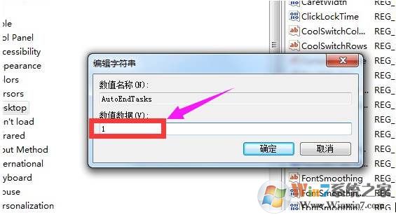 4、雙擊打開(kāi)編輯字符串,后在【數(shù)值數(shù)據(jù)(V)】把它的值改為“1”,點(diǎn)擊“確定”。