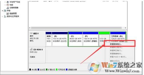 7、然后右鍵點擊可用空間,選擇新建簡單卷;