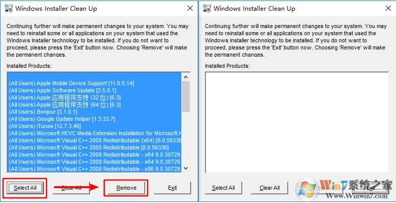 打開Windows Install Cleanup后會自動載入所有安裝包信息,點擊左下角的Select All選擇全部安裝包信息。