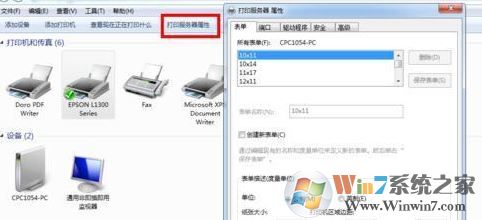 3、單擊 “打印服務器屬性”,會彈出一個設置對話框,后紙張設置的問題就是在這個對話框中設置的。