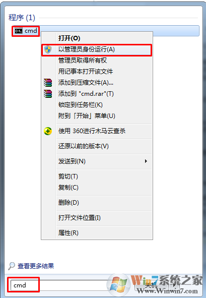 1.開始->在搜索框中輸入‘cmd’->搜出的cmd.exe文件上點擊右鍵,選擇‘已管理員身份運行’: