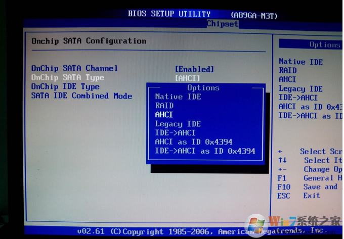 3.重啟電腦在進入啟動界面之前,按下鍵盤上的Del鍵,進入BIOS,在“Integrated Peripherals”頁面中,將“SATA RAID/AHCI Mode”更改為“AHCI”(不同BIOS選項名稱會有細微差別)。