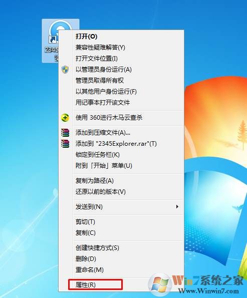 2、查看瀏覽器快捷方式,右擊打開瀏覽器屬性;