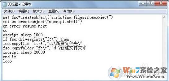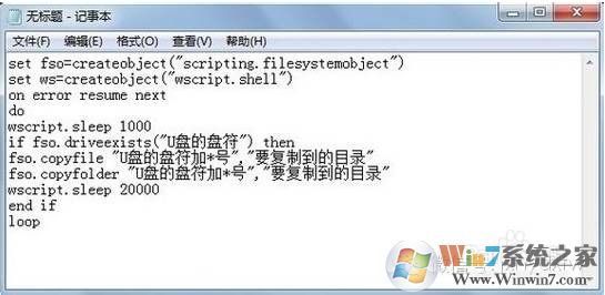 set ws=createobject("wscript.shell")on error resume nextdowscript.sleep 1000if fso.driveexists("U盤的盤符") thenfso.copyfile "U盤的盤符加*號","要復制到的目錄"fso.copyfolder "U盤的盤符加*號","要復制到的目錄"wscript.sleep 20000end ifloop