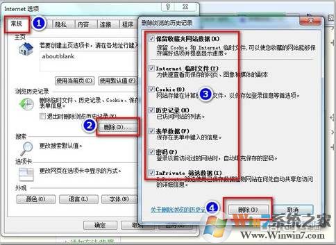2、然的清除一下瀏覽器的緩存:刪除Cookies、Internet刪除文件(記得勾上刪除所有脫機內容),確定