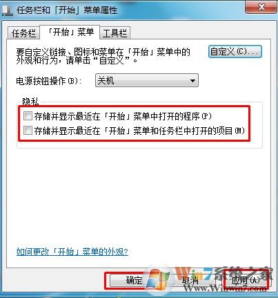 3、將下方隱私下面的“存儲并顯示最近在“并存儲顯示最近在「開始」菜單中打開的程序“和”儲存并顯示最近在“「開始」菜單中和任務欄中打開的項目“兩個選項勾去掉,點擊應用并確定;
