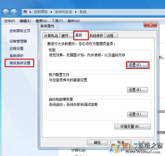 3、在系統(tǒng)屬性窗口中,直接點擊“設置”;