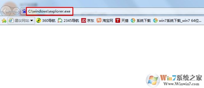 首先,我們隨便的打開一個(gè)IE瀏覽器,然后我們在網(wǎng)址欄中輸入C:\windows\explorer.exe并按下回車就可以了!這個(gè)是最簡單,也是最基本的解決方法,當(dāng)然有的win7系統(tǒng)調(diào)用失敗并非這樣就可以解決。