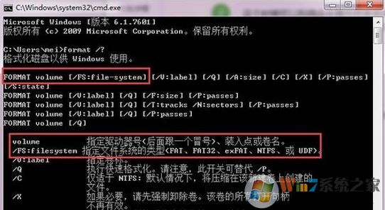 2、在命令提示符中鍵入:format /? 可以查找format相關(guān)的參數(shù),如圖: