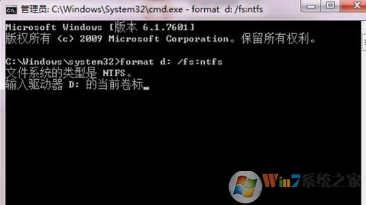 3、當(dāng)前D盤出問題,所以小編是這么輸入的:format d: /fs:ntfs 輸入后按下回車鍵會(huì)提示輸入當(dāng)前驅(qū)動(dòng)器的卷標(biāo):