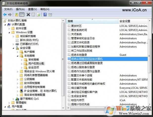 2)點(diǎn)“用戶權(quán)限分配”,在右邊的策略中找到“拒絕從網(wǎng)絡(luò)訪問這 臺(tái)計(jì)算機(jī)”,把guest刪除、保存即可。