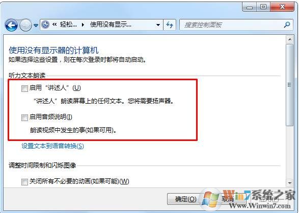 4、到這里從家就可以看到了吧,取消勾選,啟用”講述人“,然后取消 啟用音頻說明 這兩個(gè)選項(xiàng)。