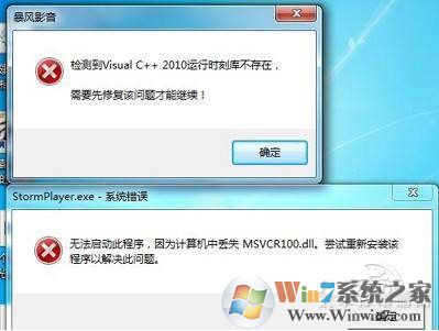 如下圖,暴風(fēng)影音無法啟動,也是出現(xiàn)缺少msvcr100.dll的問題,同時提示未安裝VC++ 2010運行庫。