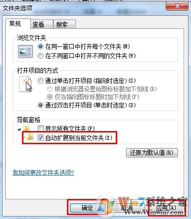 2、在彈出來的額文件夾選項界面中,在下方的導(dǎo)航窗格中,勾選“顯示所有文件夾”和“自動擴(kuò)展到當(dāng)前文件夾”選項,然后點擊確定即可。