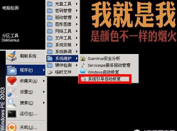 5、在進(jìn)入PE之后,我們選擇開始菜單---系統(tǒng)維護(hù)---系統(tǒng)引導(dǎo)自動修復(fù),根據(jù)軟件引導(dǎo)修復(fù)系統(tǒng)啟動項,修復(fù)成功后,重啟計算機(jī)。