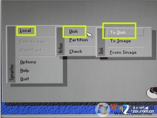 1、 首選進(jìn)入PE,然后找到GHOST工具,并打開進(jìn)行手動操作,進(jìn)入界面后,選擇“Local”→“Disk”→“To Disk”。